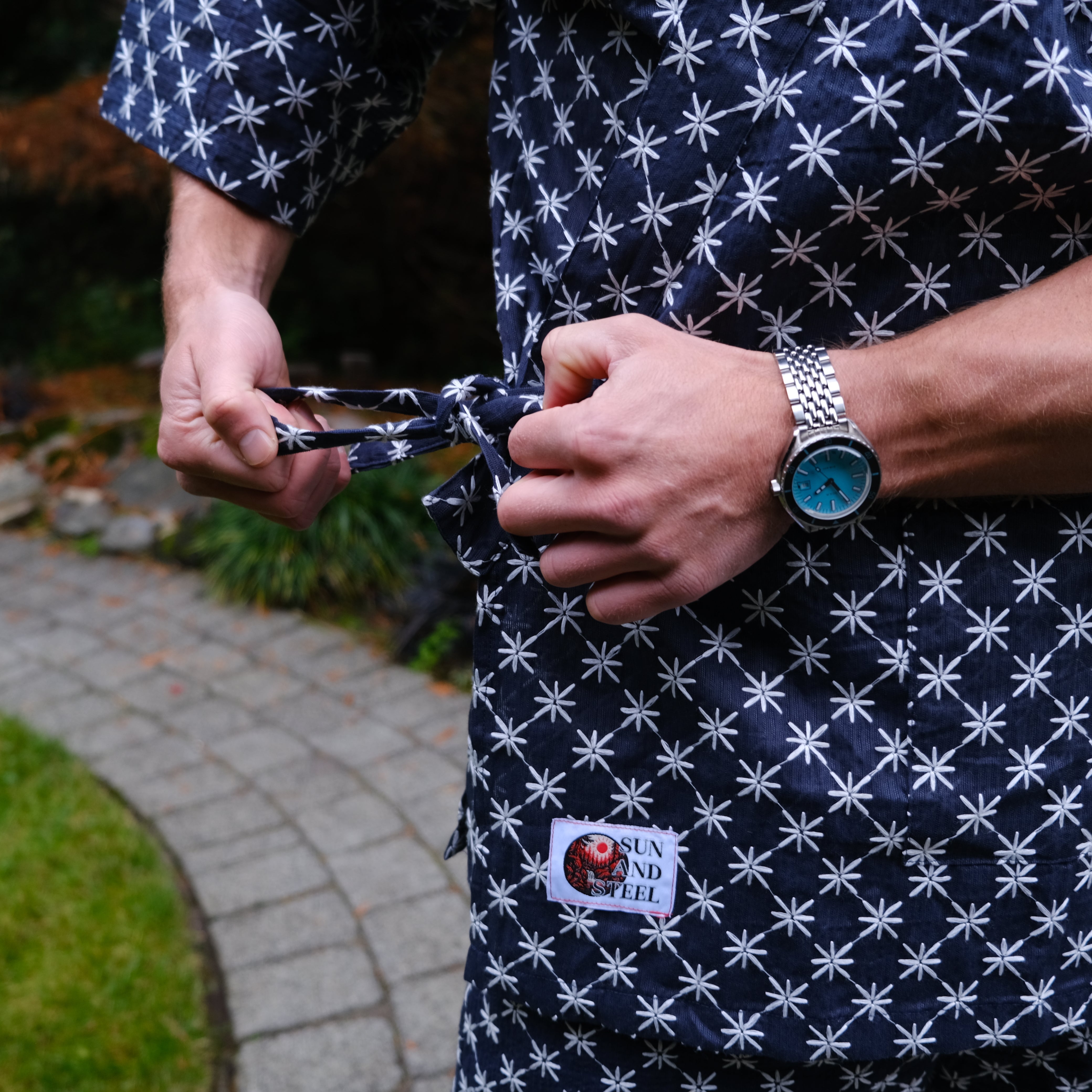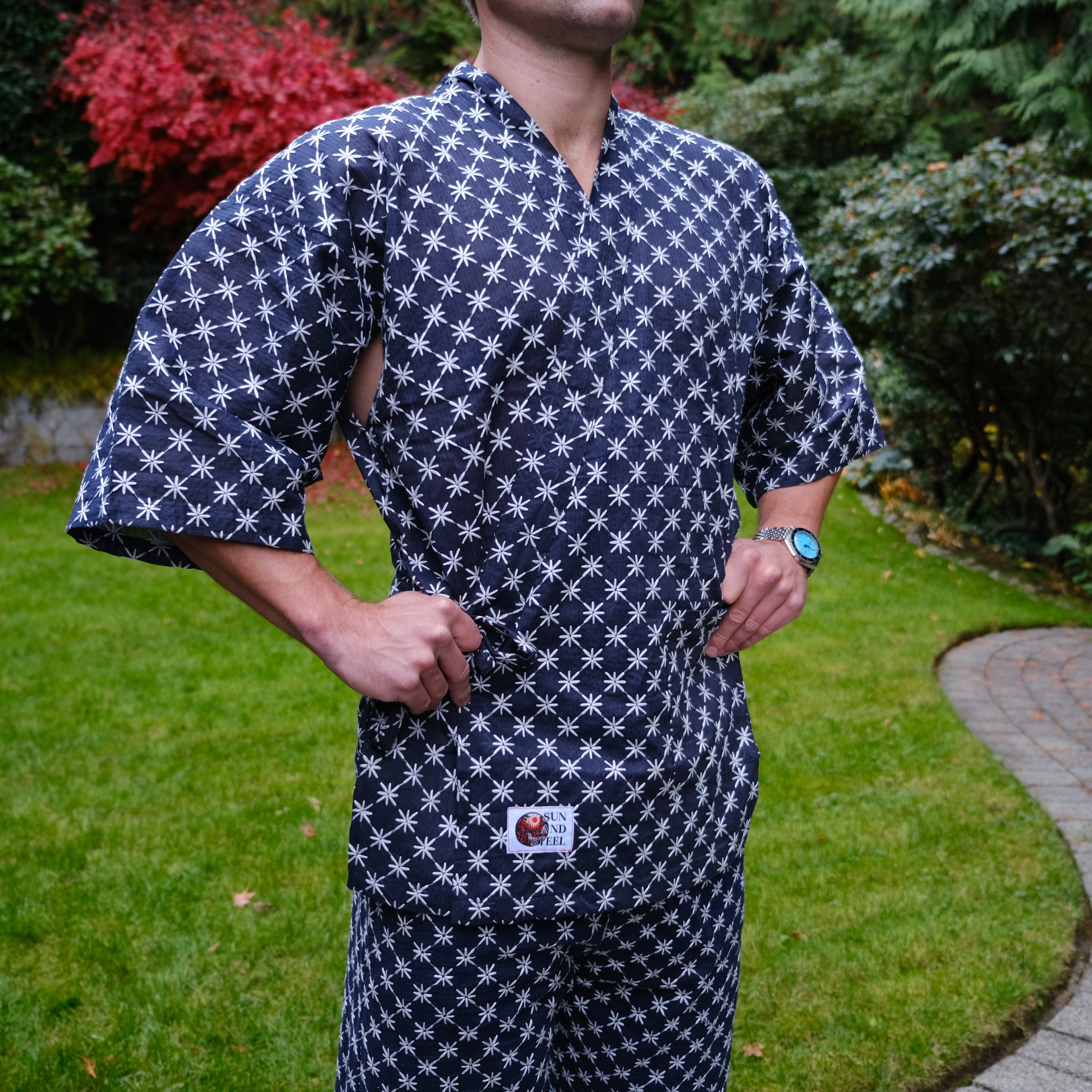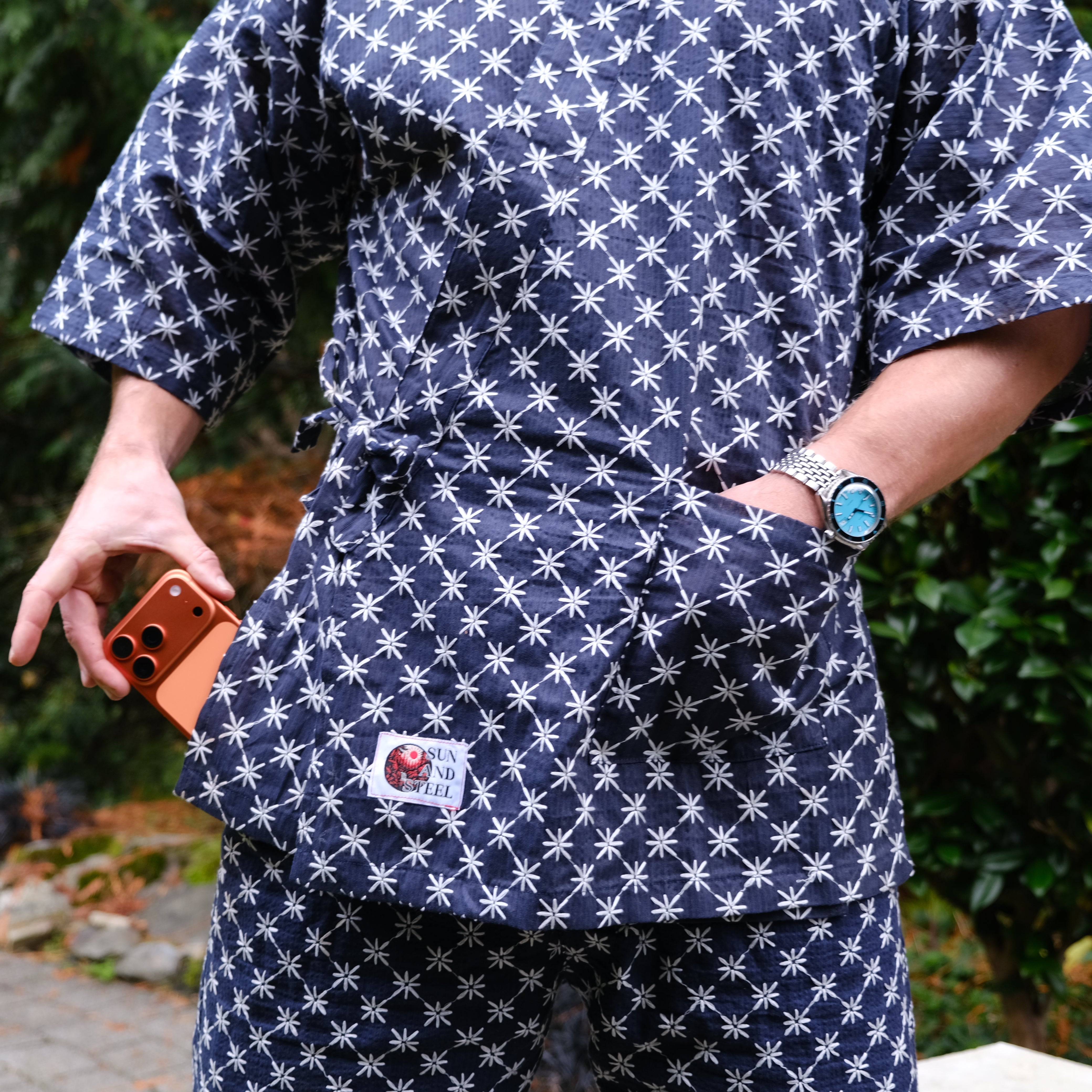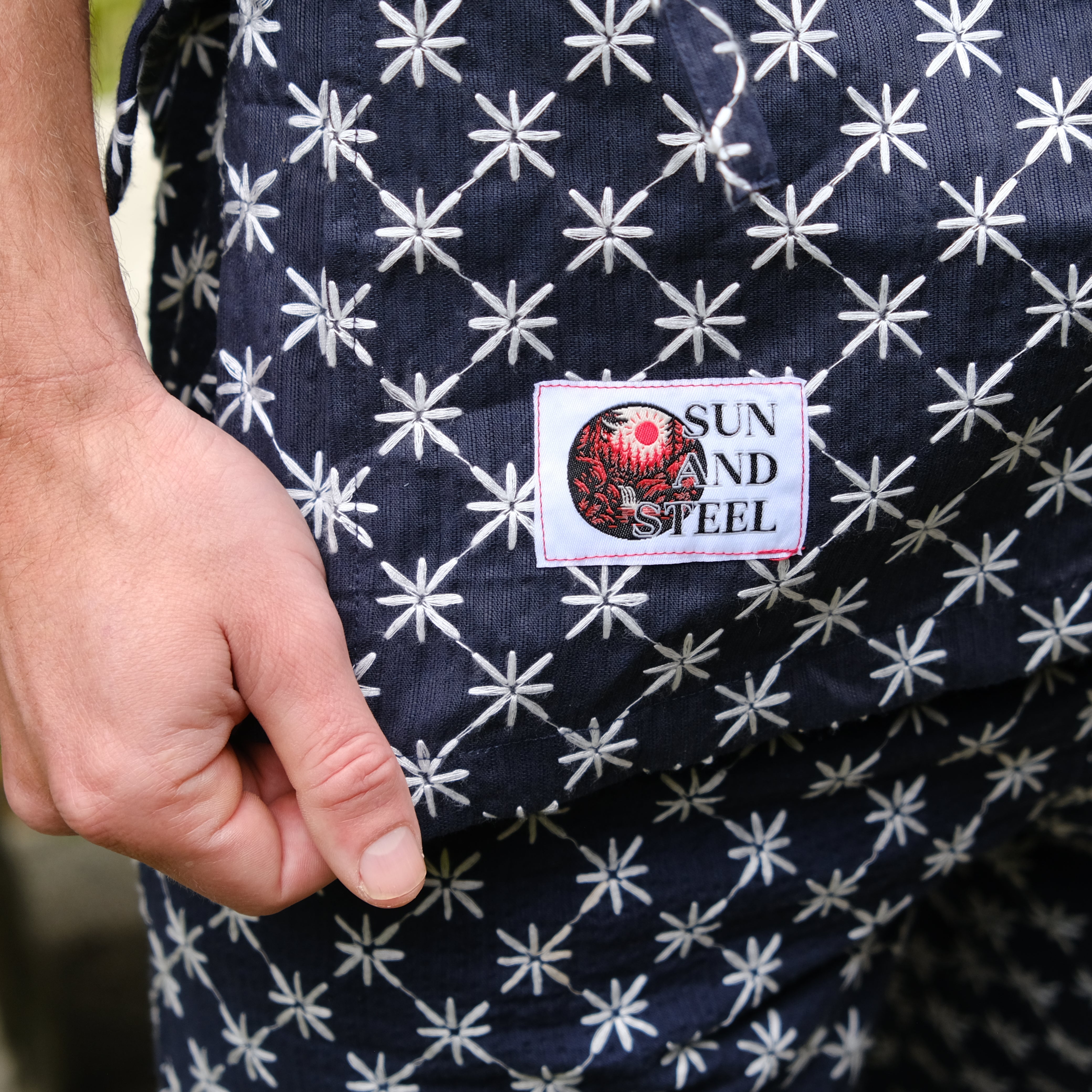 The Sun And Steel Gym Gi - A rare blend of comfort and confidence. The ultimate fit for the gym, sauna, cold plunge, beach and around the house. This timeless style is 100% organic cotton, custom embroidered with traditional Japanese Shashiko stitching.